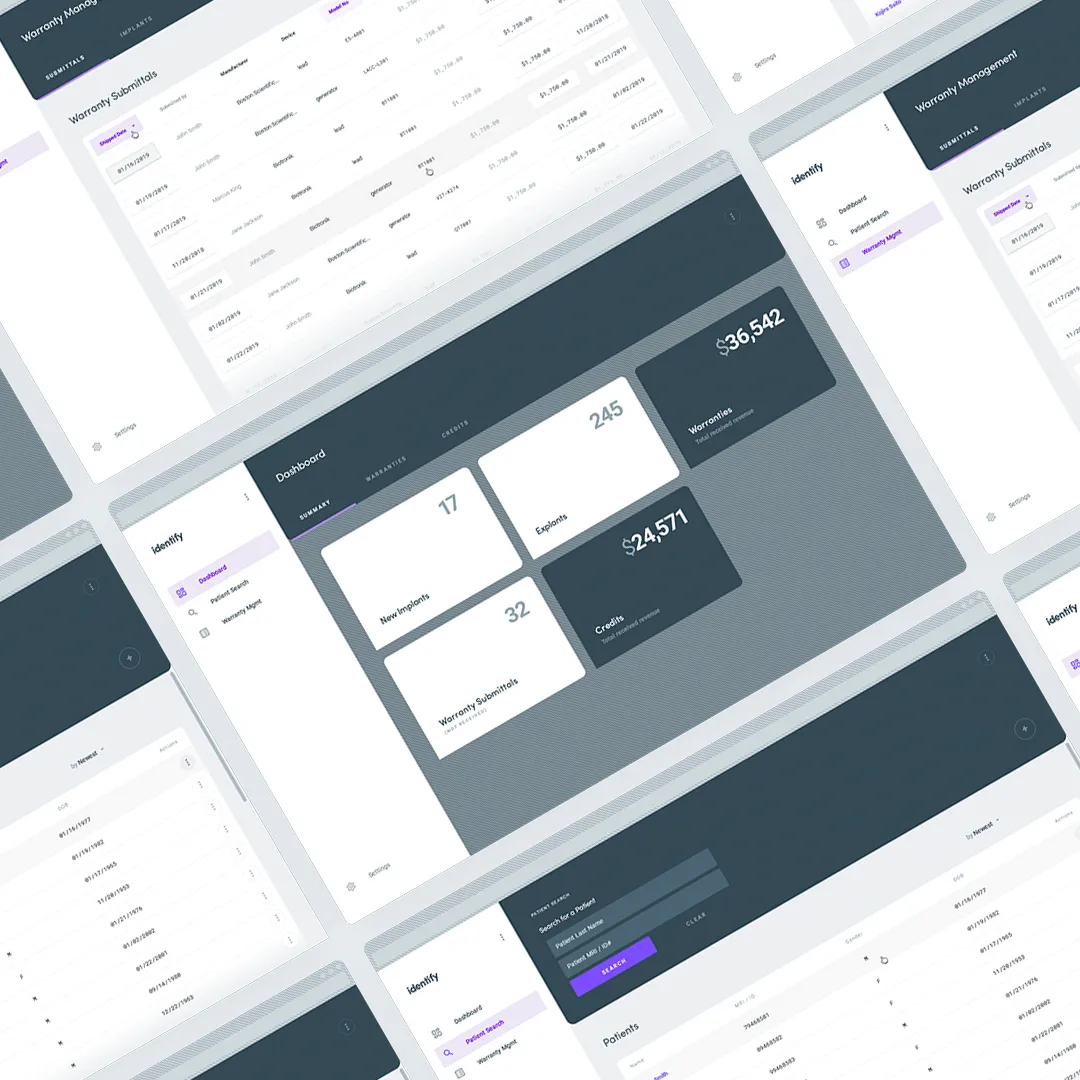 Identify Medical is a web application for managing medical implant warranties. I designed the interface around a warranty dashboard for tracking submittals, device details, and transaction history.
